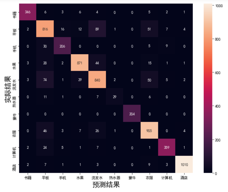 从以上F1分数上看,"蒙牛"类的F1分数最大(100%),“热水器”类F1分数最差只有67%,究其原因可能是因为“热水器”分类的训练数据最少只有574条,使得模型学习的不够充分,导致预测失误较多吧。
