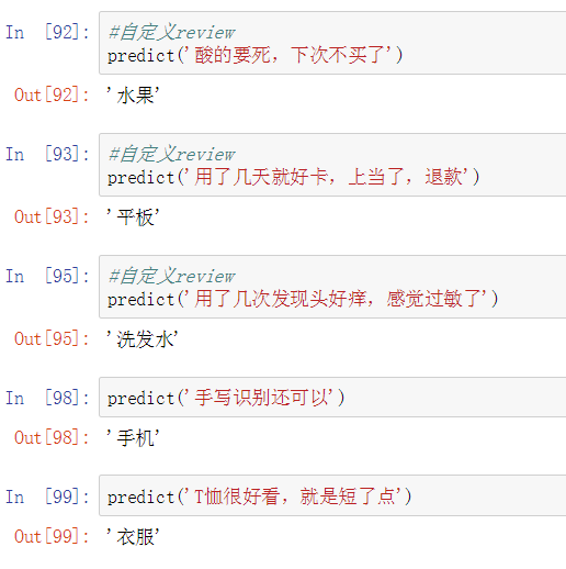 首先我们定义一个预测函数:通过输入一段评语,来预测它的类目