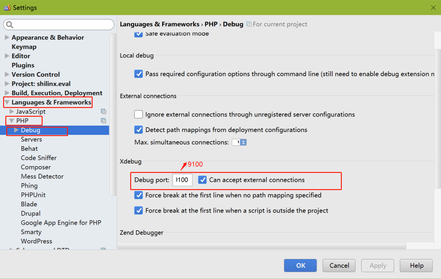 打开PHPstorm,File->setings->PHP -> Debug -> XDebug -> Debug Port 改为 9100 ,并设置Server和PHP Web Application,打断点,调试即可。