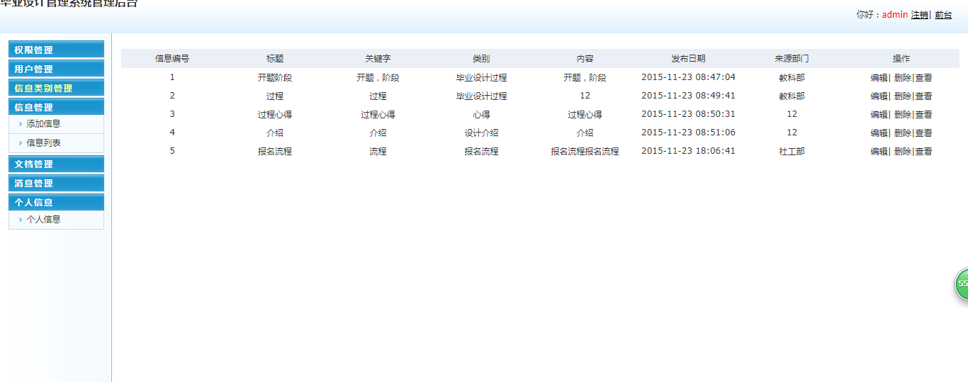 (4)信息管理:对信息信息进行添加、删除、修改和查看