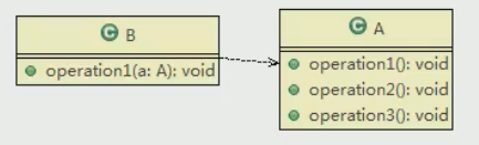 改进,将A作为参数传入B类的方法中(即,依赖关系),B类依然可以使用到A类的方法。