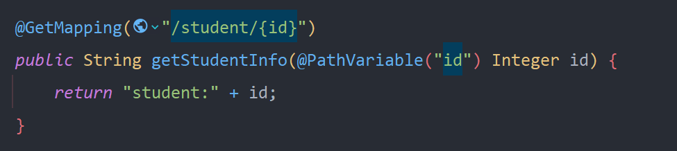- 举例说明,要获取某一个id的学生的信息,那么设计出来的RESTful API为GET /student/{id},对应的实现如下图: