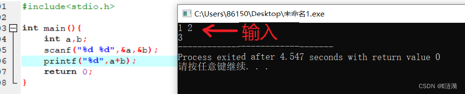 scanf("%s",name);在输入时,为表示是两个变量(如下图:表示是1和2而不是12)可用空格,换行符或制表符把输入的各变量分开(在转换说明为%c时除外),例: