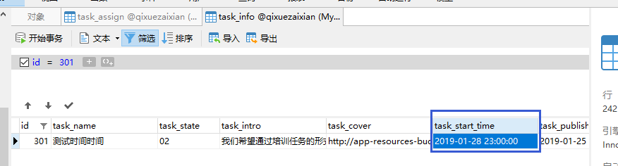 主要修改内容 <result column="task_start_time" jdbcType="TIMESTAMP" property="startTime" />