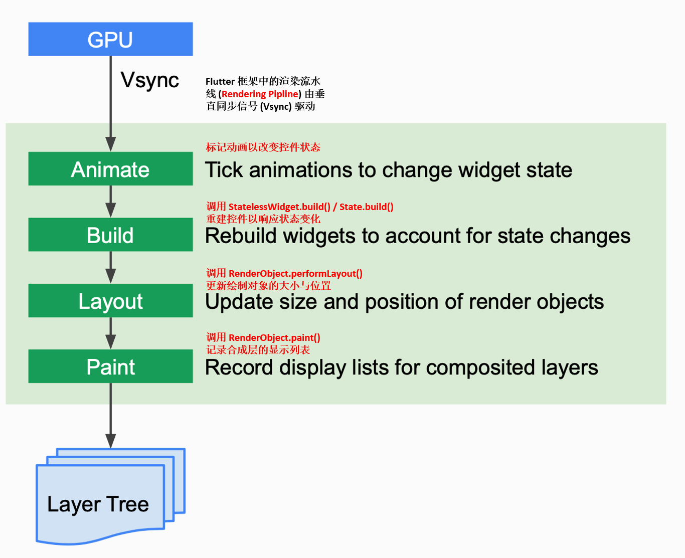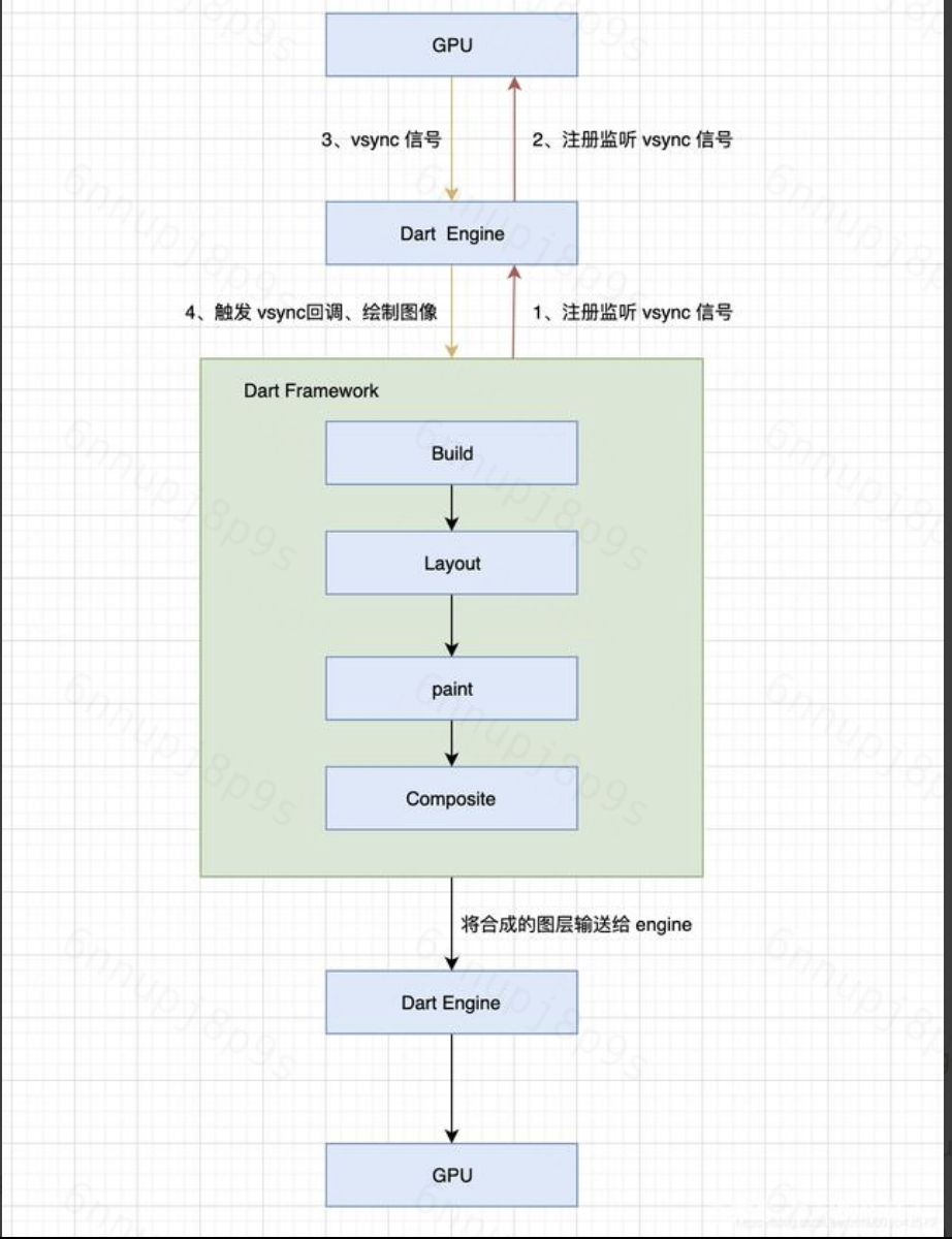 1.GPU发起VSYNC信号:由GPU发起同步帧信号后,将信号传递至dart引擎进行处理,dart引擎在每个同步帧信号的间隙进行视图的构建、布局和渲染。