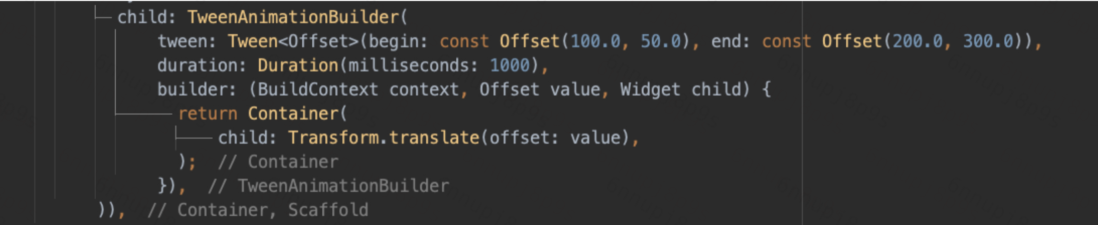 除此之外,我们还可以使用TweenAnimtedBuilder自定义隐式动画来实现自带控件之外的隐式动画,写法也非常简单。我总结出来的套路就是TweenAnimatedBuilder + 每一帧变换的widget。代码如下