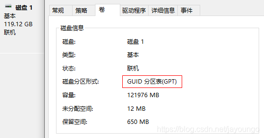 右键磁盘名打开“属性”,点击“卷”,请确认分区为GPT