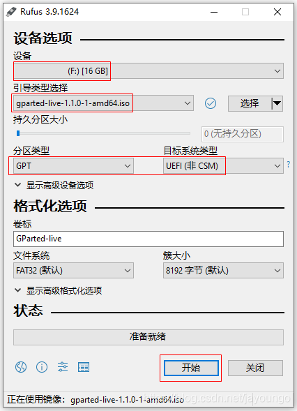 打开Rufus软件(免安装),将GParted Live的ISO文件写入U盘: