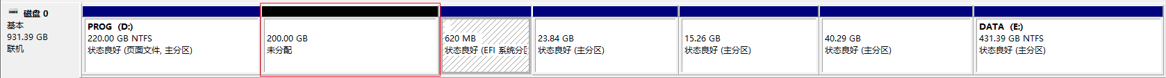 右键想要压缩空间给Linux系统的分区,选择“压缩卷”,从中分出你想分给Linux的大小,这里分了200G,显示如下: