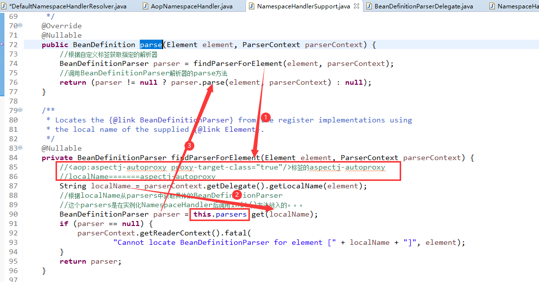 3.在parse()方法中先根据标签到parsers属性中获取到具体的BeanDefinitionParser解析类,然后调用BeanDefinitionParser解析类的parse。在parse方法中将标签属性封装到BeanDefinition中,然后注册到Spring容器中。(parsers属性就是我们调用NamespaceHandler的init方法的时候注入的)