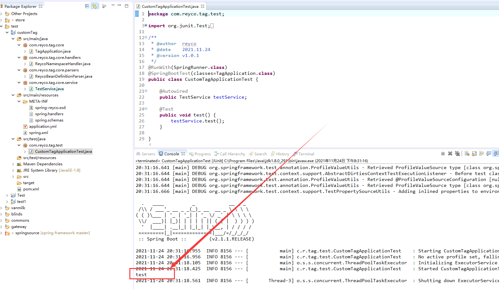 8. 测试是否可以正常使用,看下图,可以正常打印test说明我们的自定义标签起作用了!