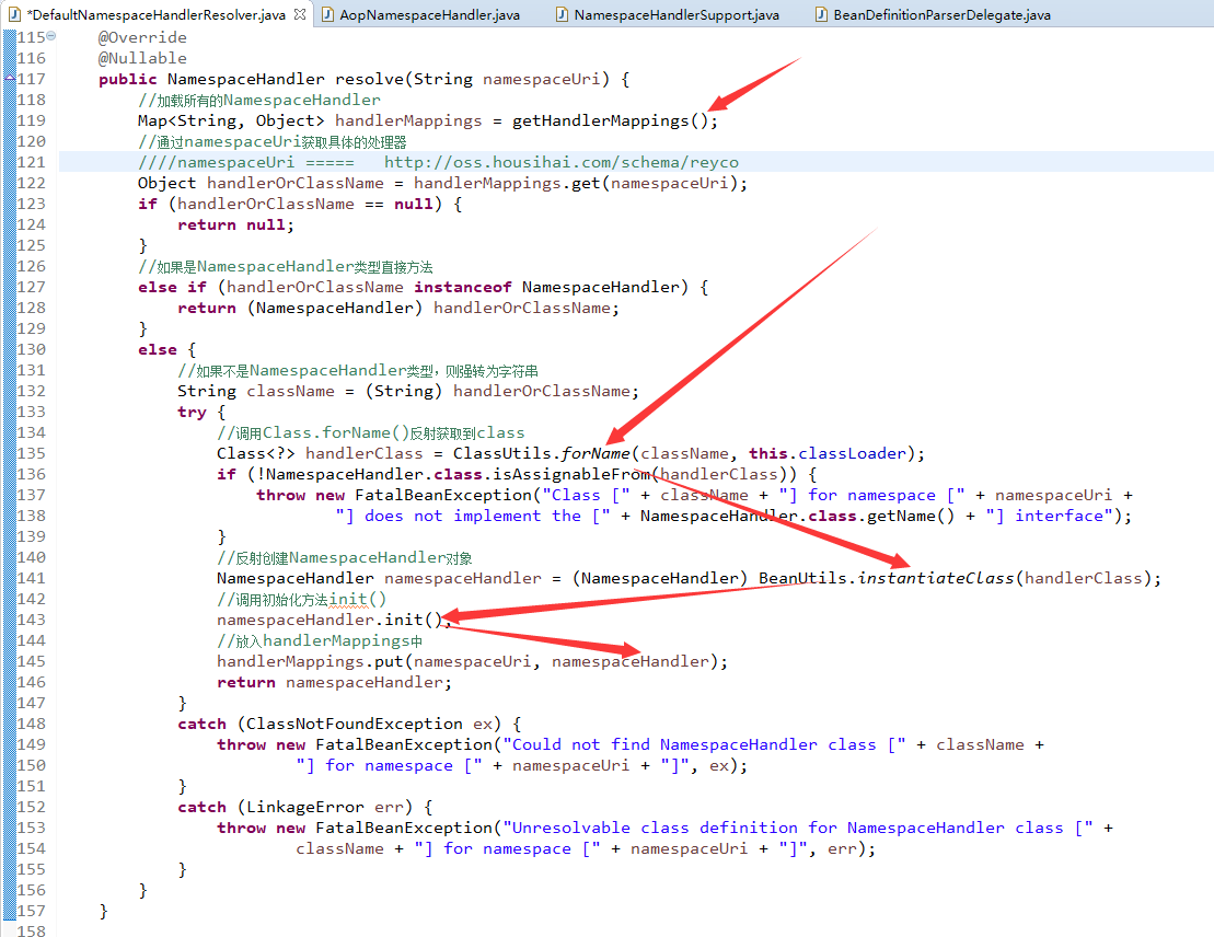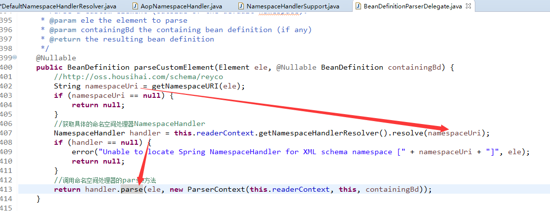 2. 根据namespaceUri(http://oss.housihai.com/schema/reyco)获取到具体的NamespaceHandler,然后调用它的parse()方法。