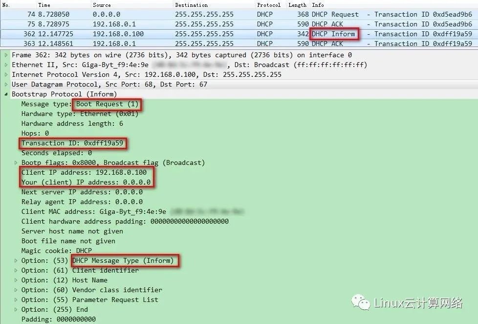 以上所有的包类型,一般只是针对主机的 IP 地址进行分配,当然,DHCP 是可以提供更多的网络信息的,比如网关地址、DNS 服务器地址等等,这些信息一般就是通过 DHCP INFORM 消息单独获得,当 DHCP Server 收到该报文时,会查询相关的租约信息,找到相应的配置信息后,发送 DHCP ACK 报文给到 Client。