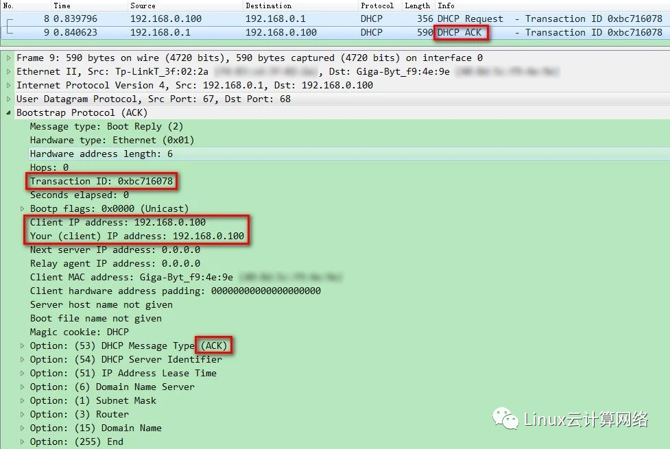 当被 Client 接受的 DHCP Server 收到 DHCP REQUEST 包时,会根据 REQUEST 包中携带的 Client 的 MAC 来查找是否有相应的租约记录,如果有则广播一个 DHCP ACK 包,仍然还是广播,因为 Client 的地址还是未知的。其中,包的内容包含分配的 IP 地址、租约时间等确定的信息。