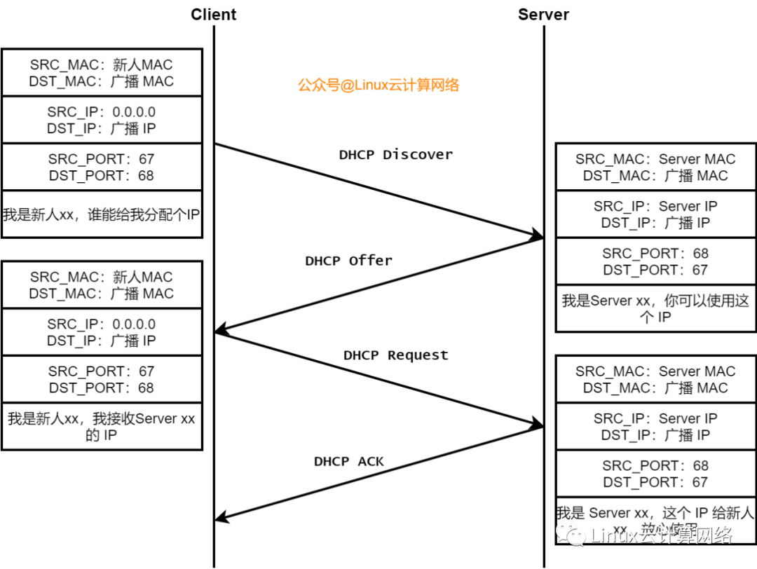 ① 客户端初始请求 DHCP 服务器:发送 DHCP DISCOVER 包