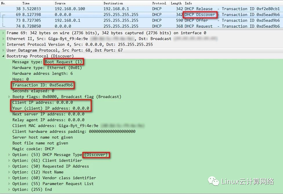 当 DHCP Client 第一次启动接入网络时,此时还没有 IP 地址,它就向网络当中所有的 DHCP Server 发送一个 DCHP DISCOVER 的广播包。其中包的源目的端口分别是 67、68(DHCP 基于 UDP 协议,使用 UDP 67、68 端口来指代客户端和服务端);源目的 IP 地址分别是 0.0.0.0,255.255.255.255;然后包的内容会包含标识客户端的 MAC 地址和主机名等信息。(等于向网络传达:我是新人,谁能给我分配个 IP)。