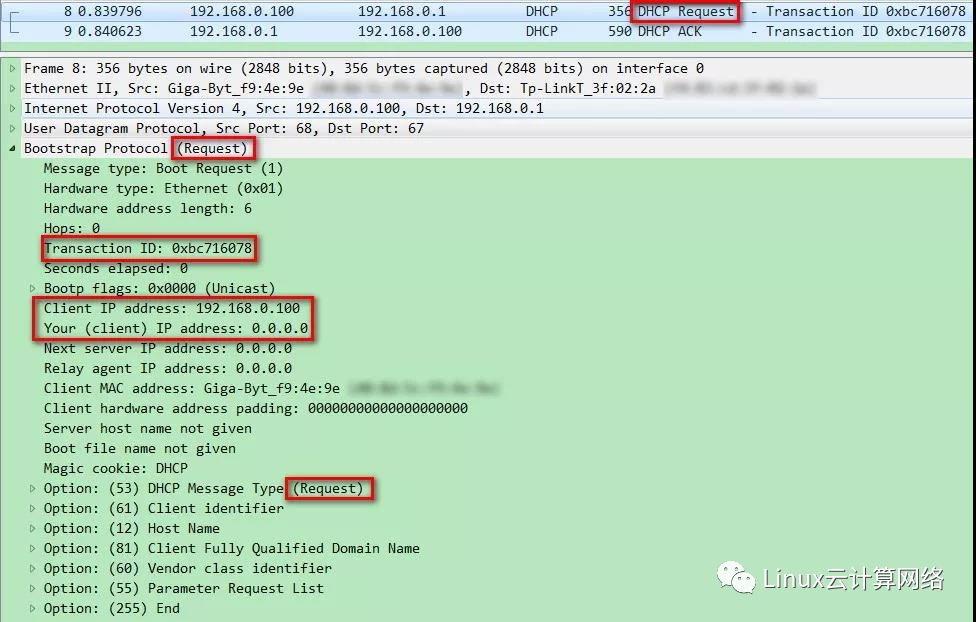 其中,包的源 IP 仍然是 0.0.0.0,因为还没有得到 DHCP Server 的确认,包的内容包含 Client 的 MAC 地址、接受租约的 IP 地址以及提供此租约的 DHCP Server 的地址等信息。