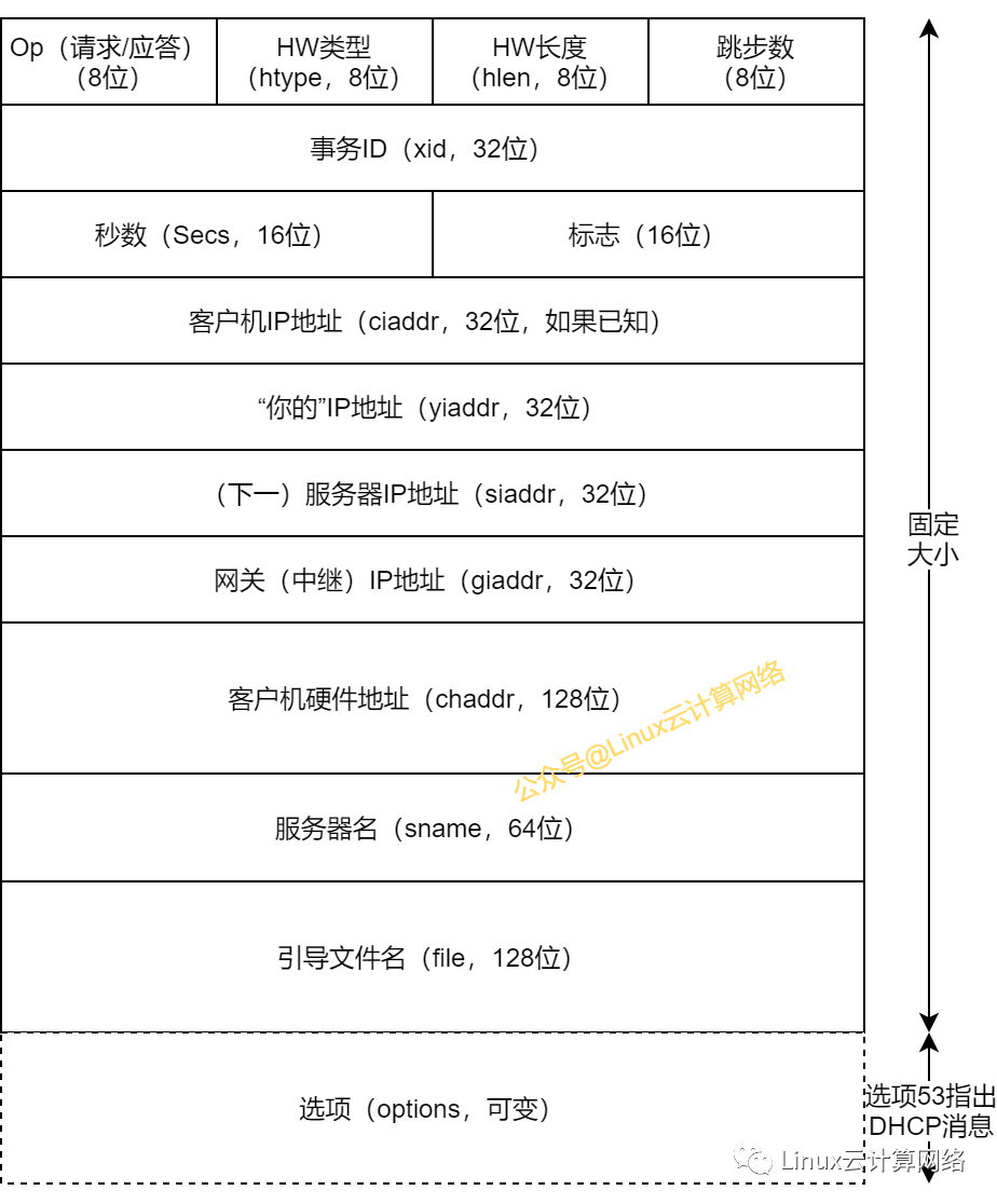 options:选项字段,长度可变,有多种选项,其中选项 53 就用于标识上述的各种消息
