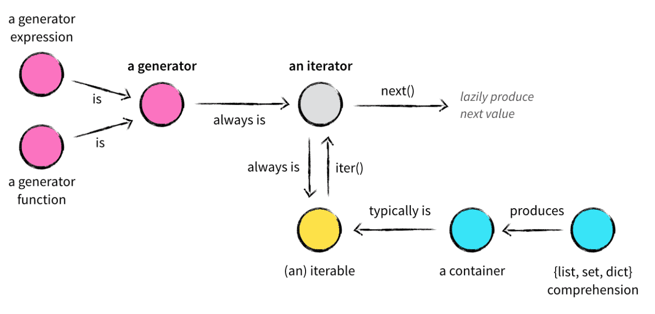 | 说明 | 实现了__iter__和__next__方法的对象都称为迭代器 迭代协议: 当任何可迭代对象传入到for循环或其他迭代工具中进行遍历时,迭代工具都是先通过iter函数获得与可迭代对象对应的迭代器,然后再对迭代器调用next函数,不断的依次获取元素,并在捕捉到StopIteration异常时确定完成迭代 | 两种方式: