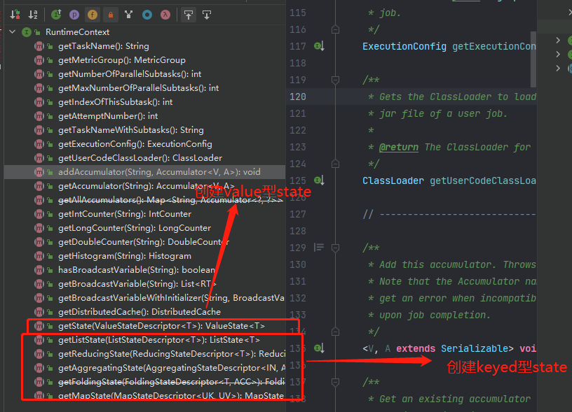 注意,这里有ValueState和KeyedState两种不一样的创建方法,这两种类型在后面多处都有体现