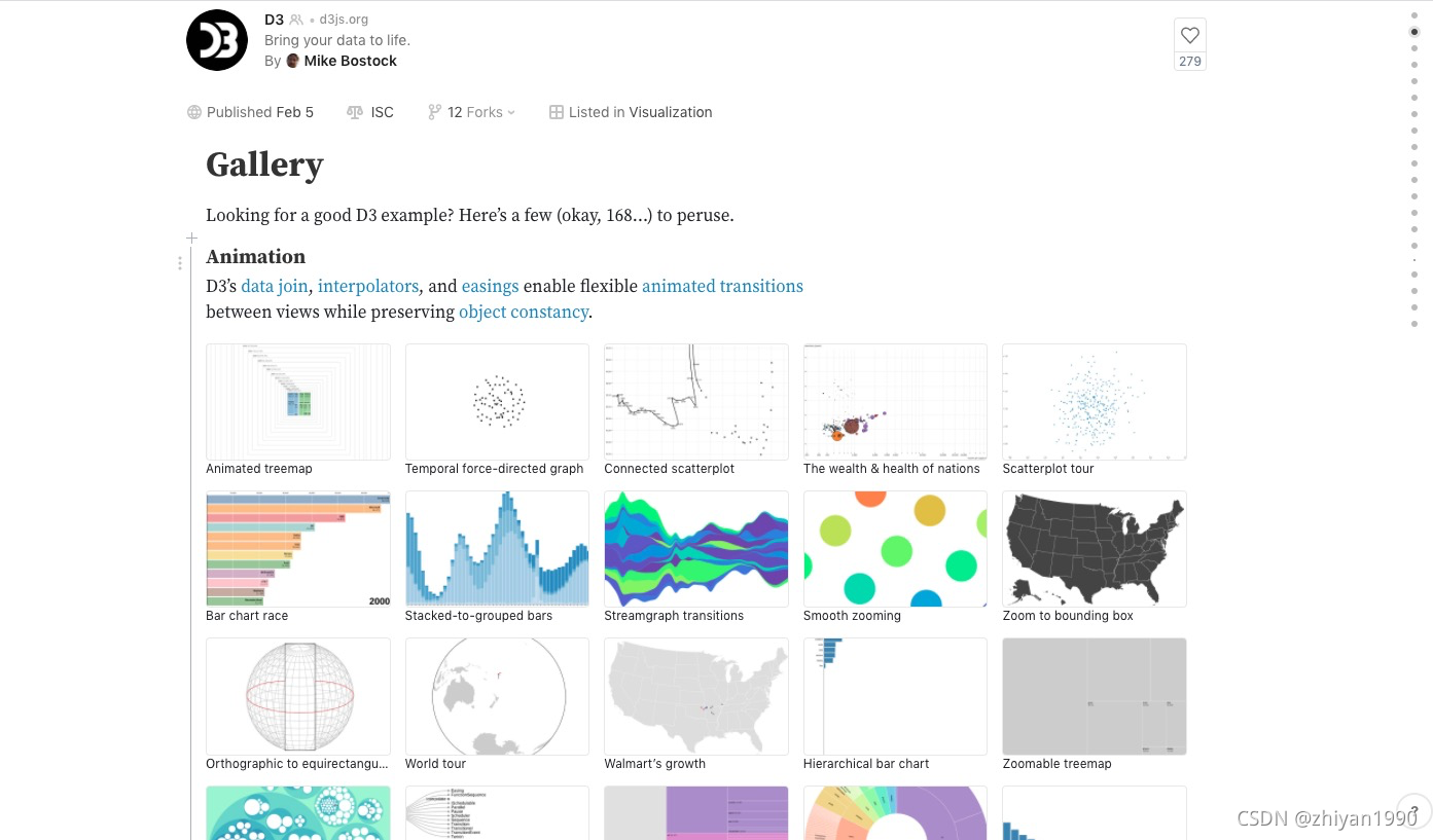 该库更接近底层,与 g2、echarts 不同,d3 能直接操作 svg,所以拥有极大的自由度,几乎可以实现任何 2d 的设计需求。正如其名 Data Driven Documents,其本质是将数据与 DOM 绑定,并将数据映射至 DOM 属性上(这时视觉通道、比例尺转换等理论就可发挥作用喽~)