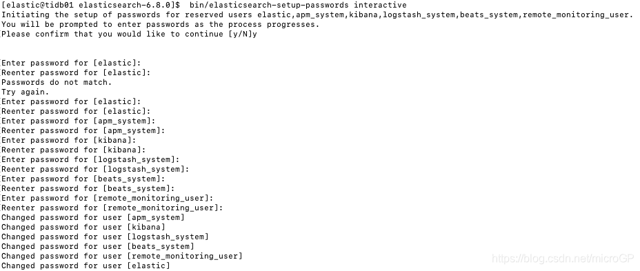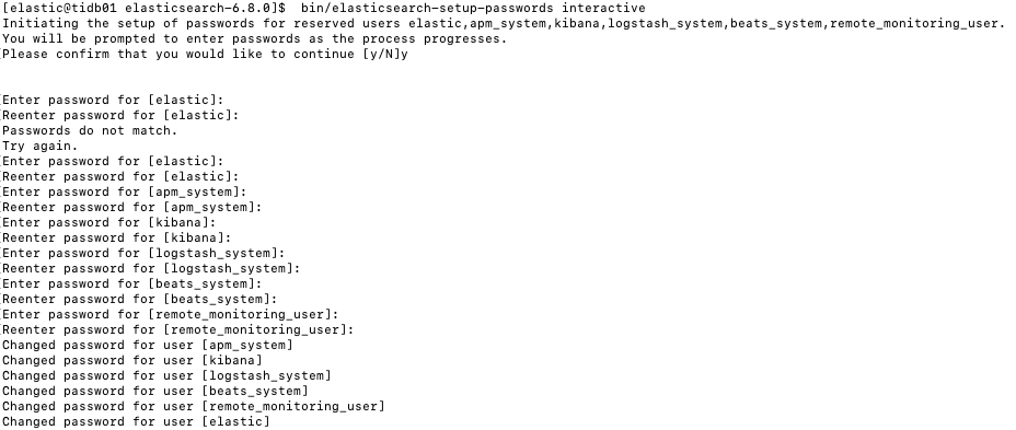 bin/elasticsearch-setup-passwords interactive 本次配置需要设置elastic,apm_system,kibana,logstash_system,beats_system,remote_monitoring_user所有这些用户的密码,如果某些用户和功能不需要,则可以在上一步的elasticsearch.yml中配置功能禁用,界面如下: