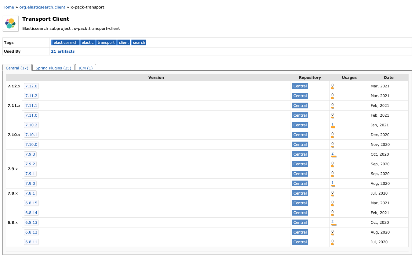 </dependency>此处需要注意,maven的仓库中x-pack-transport的版本只有如下版本: