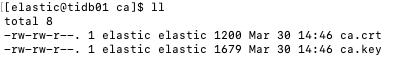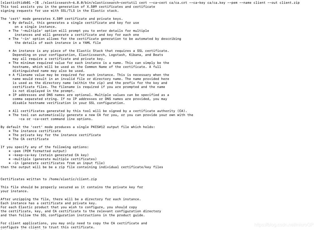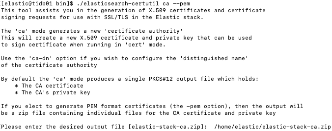 命令执行之后会生成一个zip文件,需要手动指定zip文件的存放地址,我指定的是:/home/elastic/elastic-stack-ca.zip