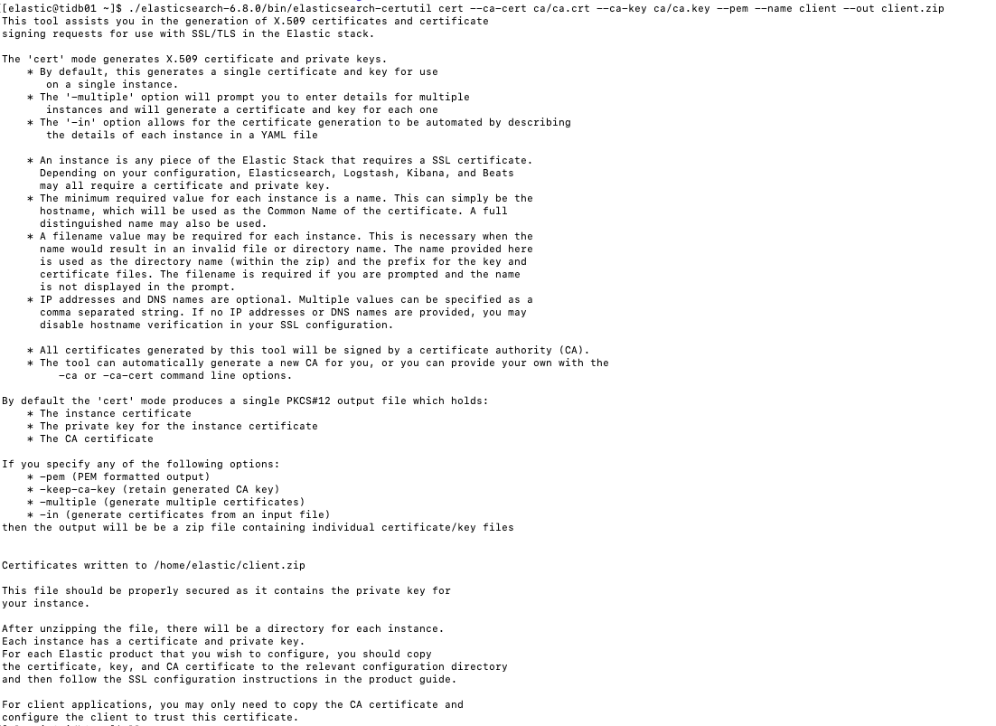 ./elasticsearch-6.8.0/bin/elasticsearch-certutil cert --ca-cert ca/ca.crt --ca-key ca/ca.key --pem --name client --out client.zip结果如下: