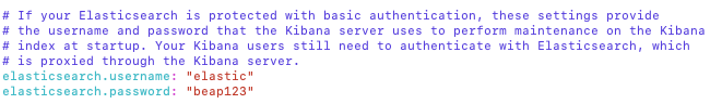 最后说说kibana的适配吧,由于在kibana的配置文件中配置访问的是elasticsearch的 9200端口,所以如果仅仅配置了transport连接的验证的话,那仅需要在kibana.yml中配置elasticsearch的登录用户名和密码即可: