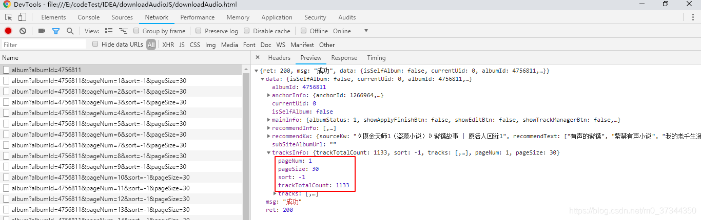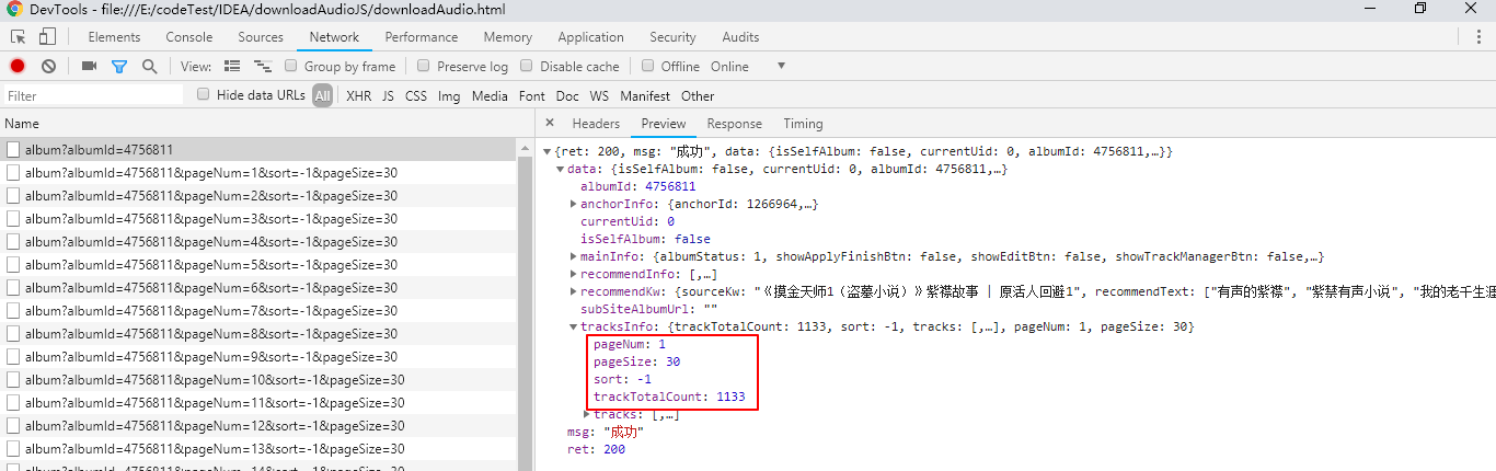 从上面文章的数据分析可以看出来,一个音频专辑的主要信息在 https://www.ximalaya.com/revision/album?albumId=4756811这个get请求中