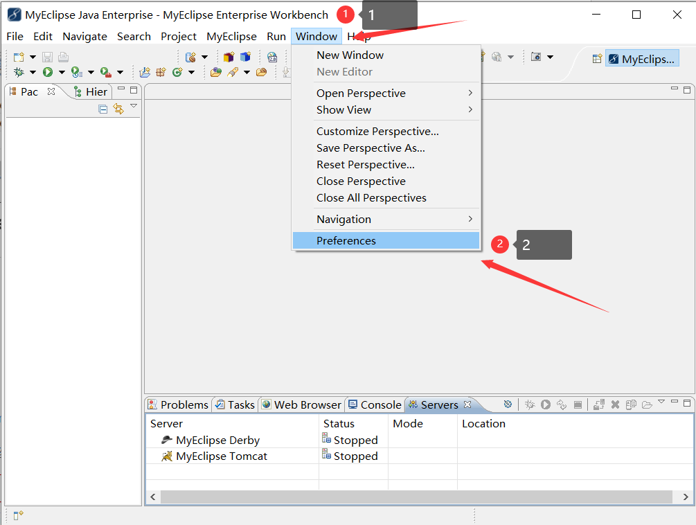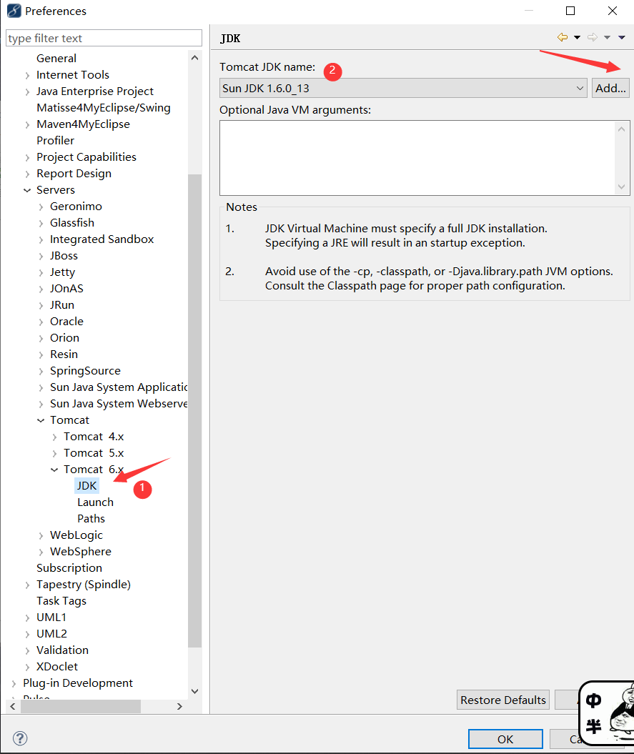 4. 按序号依次点击Myeclipse Servers Tomcat。如果之前配置过JDK,那么这一步可以省略。若没有配置过,点击JDK,再点击ADD进行配置,配置完成,点击ok就大功告成了。