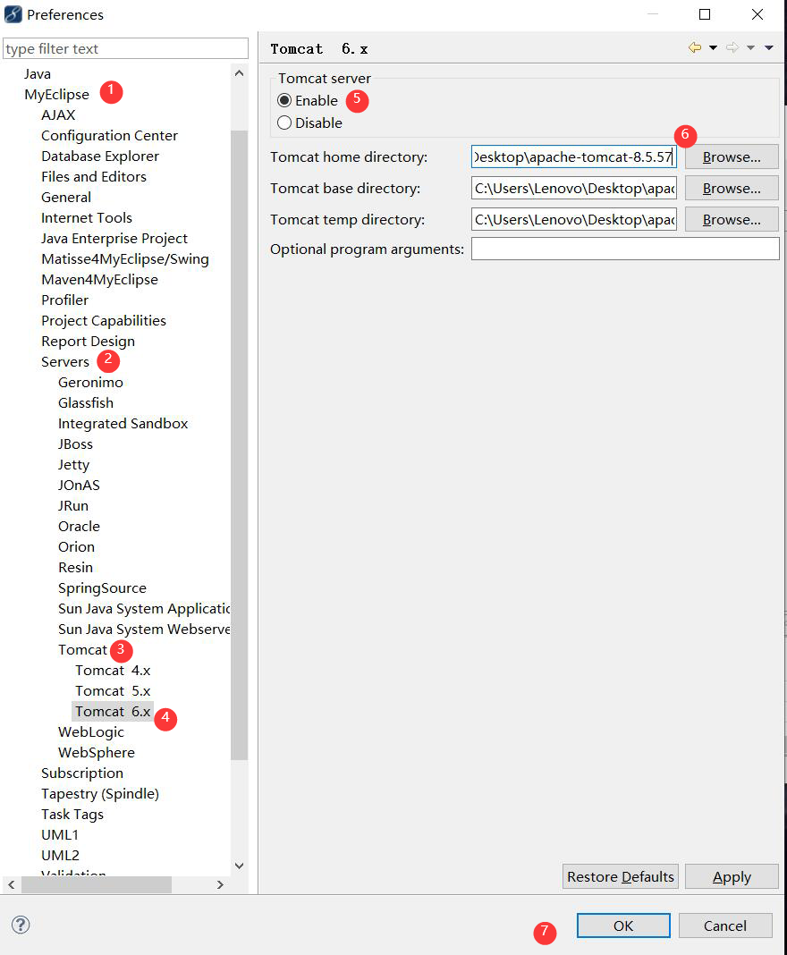 3.按序号依次点击Myeclipse Servers Tomcat 选择自己想用的版本,选择Tomcat的安装路径。一定要勾选Enable,不然配置没用