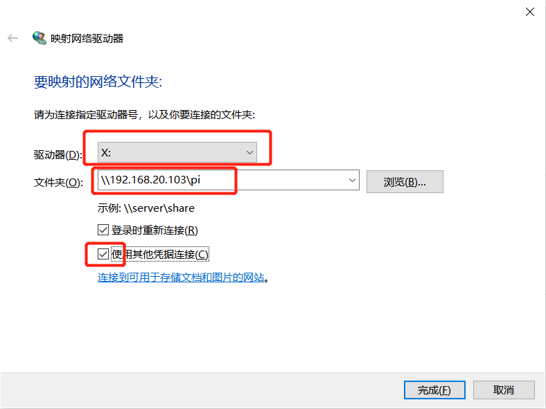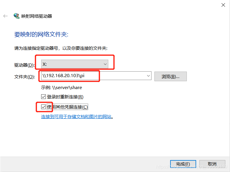 框2:文件夹就是你要映射的设备ip地址及目录(pi就是映射了pi用户的用户目录)。