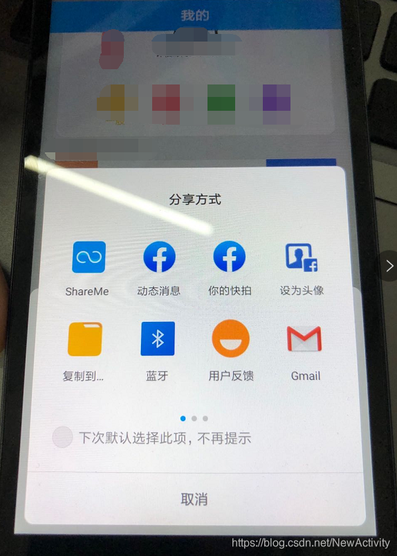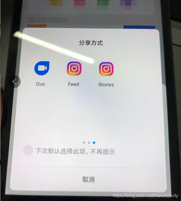 在调用分享分享时如果不使用setPackage("com.instagram.android"),就会把系统的可以分享的途径全部显示出来,想下面这样:
