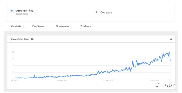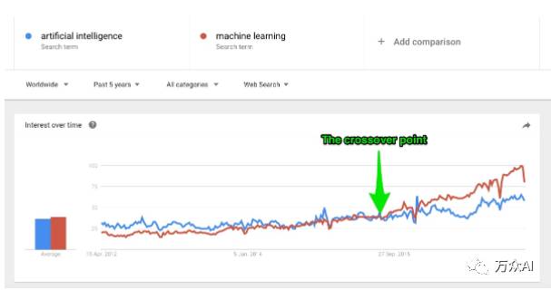 在上面的谷歌趋势图(Google Trends graph)中,大家能够看到: 在2015年9月份之前,AI 是比 机器学习(machine learning)更加受欢迎的一个搜索关键词。机器学习成了人工智能最重要的应用之一。也有许多人把机器学习描述成实现人工智能的一个子领域或者方法。
