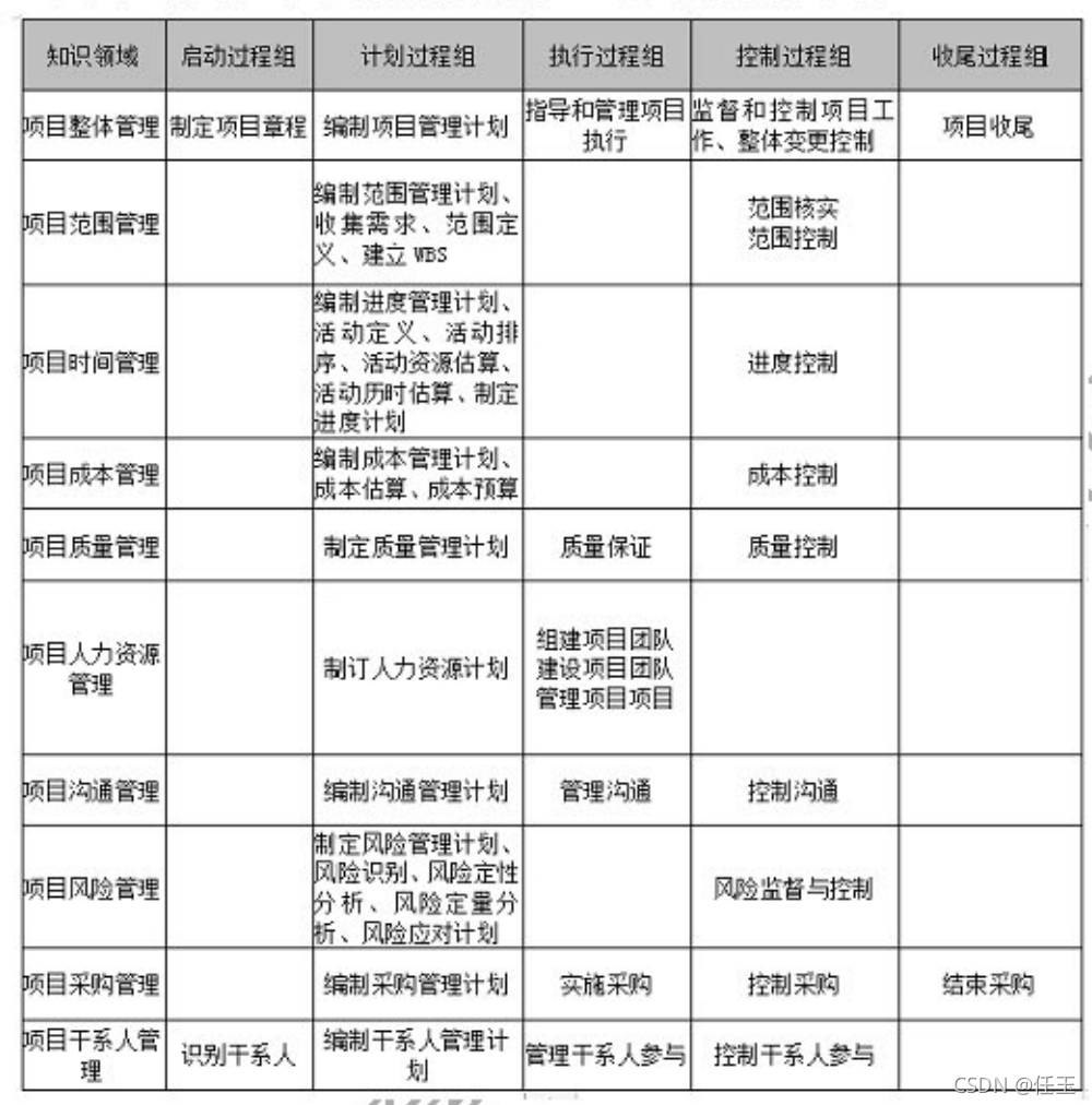 以上所有的管理并不是孤立的,而是彼此相关的。下面这是根据项目管理5个过程组来划分的对应管理的过程位置。