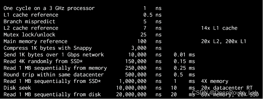 前文中我们提到了,CPU Cache是CPU和内存之间的桥梁并且拥有多个层次,可能此时我们已经发现,如果每一级缓存拥有不同的访问速度,是不是就会导致访问同样的数据(这些相同的数据可能因为之前的访问方式坐落于不同级的缓存和内存中)消耗不同的时间?答案是肯定的,下图中可以看到一个典型的现代CPU各个硬件的访问速度。可以看到,L1 Cache的访问速度基本是内存的100倍以上,L2 Cache则是10倍以上。