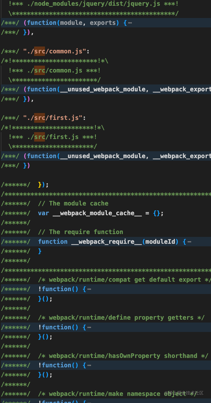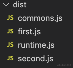 const config = {entry: {first: './src/first.js',second: './src/second.js'},output: {path: path.resolve(__dirname,'./dist'),filename: '[name].js',clean: true},optimization:{runtimeChunk: {name: 'runtime'},splitChunks: {cacheGroups: {commons: {name: 'commons', // 设置模块名称,如果不设置就是commons_node_modules_jquery_jquery_src_common_js.jschunks: 'all',minChunks: 2,},},},}
