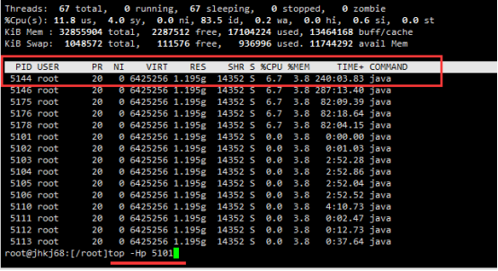 使用命令top -Hp 5101 (top -Hp PID),获取其所有线程