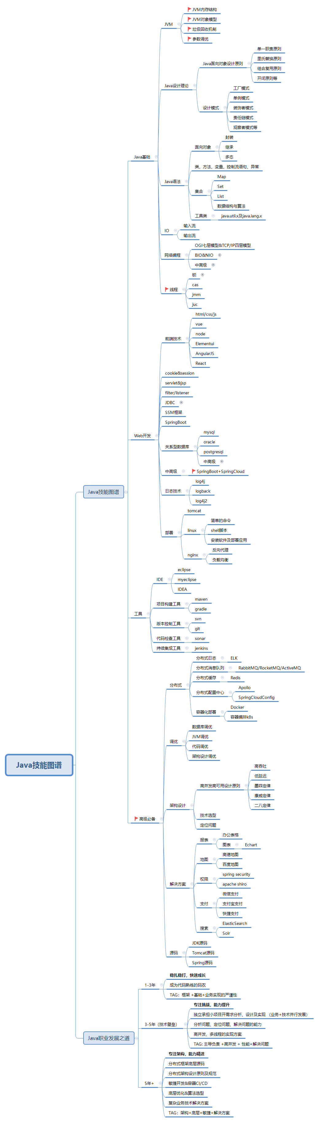 下面还有一份精心整理的Java技能图谱,要送给大家,涵盖初级中级和高级的所需所有技能。