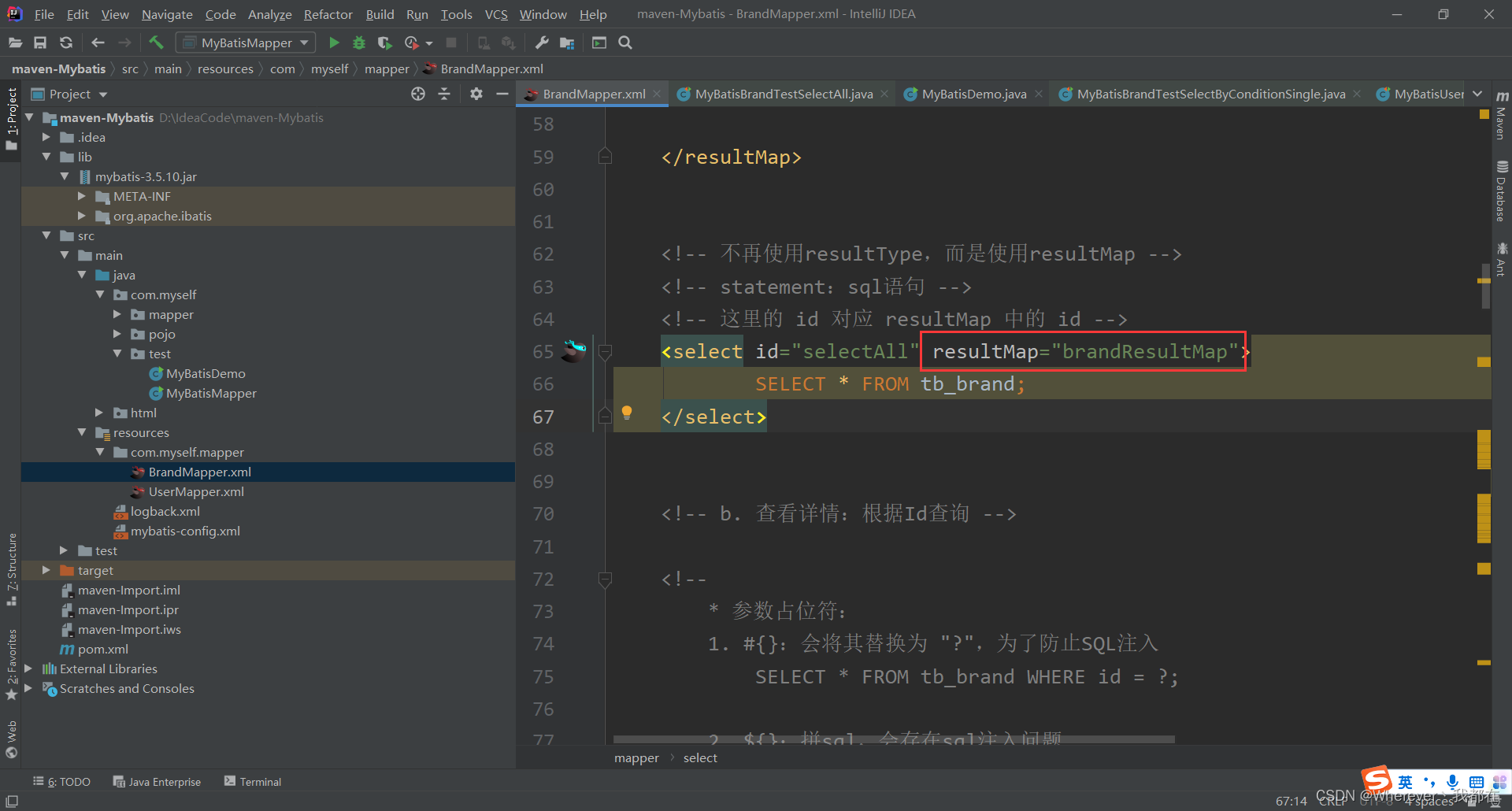 如果不想使用注解开发,也可以在mapper.xml文件中对应的方法把resultType改成resultMap,值也是上一步的id