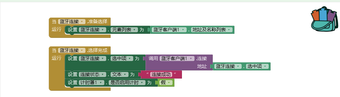 包含文本输入框,清空按钮,选择列表框。不可见组件分别是计时器和蓝牙客户端。计时器的功能是为了保证蓝牙在接收和发送的时候保持有序。我们先看蓝牙的连接程序