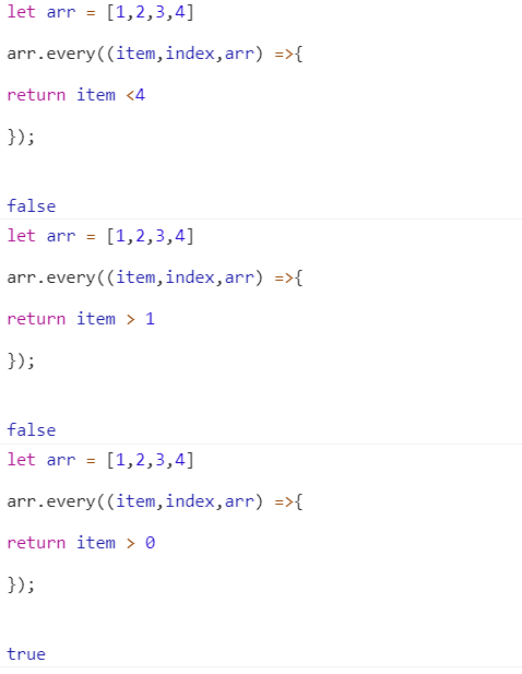 9.every() 遍历每一项,如果其中每一项都返回 true 时,最终返回 true,有一项不为true 就会返回false