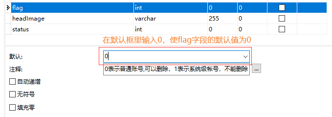 但每次手动把flag置为0很麻烦,不方便我们对表进行删除操作,所以可以设置flag字段的默认值为0,这样我们就不用手动把flag置为0