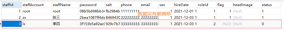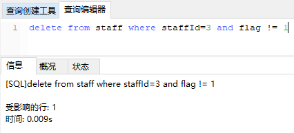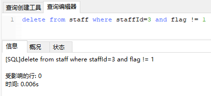 staffId为3的数据的flag为Null,虽然delete from staff where staffId=3 and flag != 1语句中的flag != 1说明了删除除1以外的数据,但却没有删除flag为Null的数据