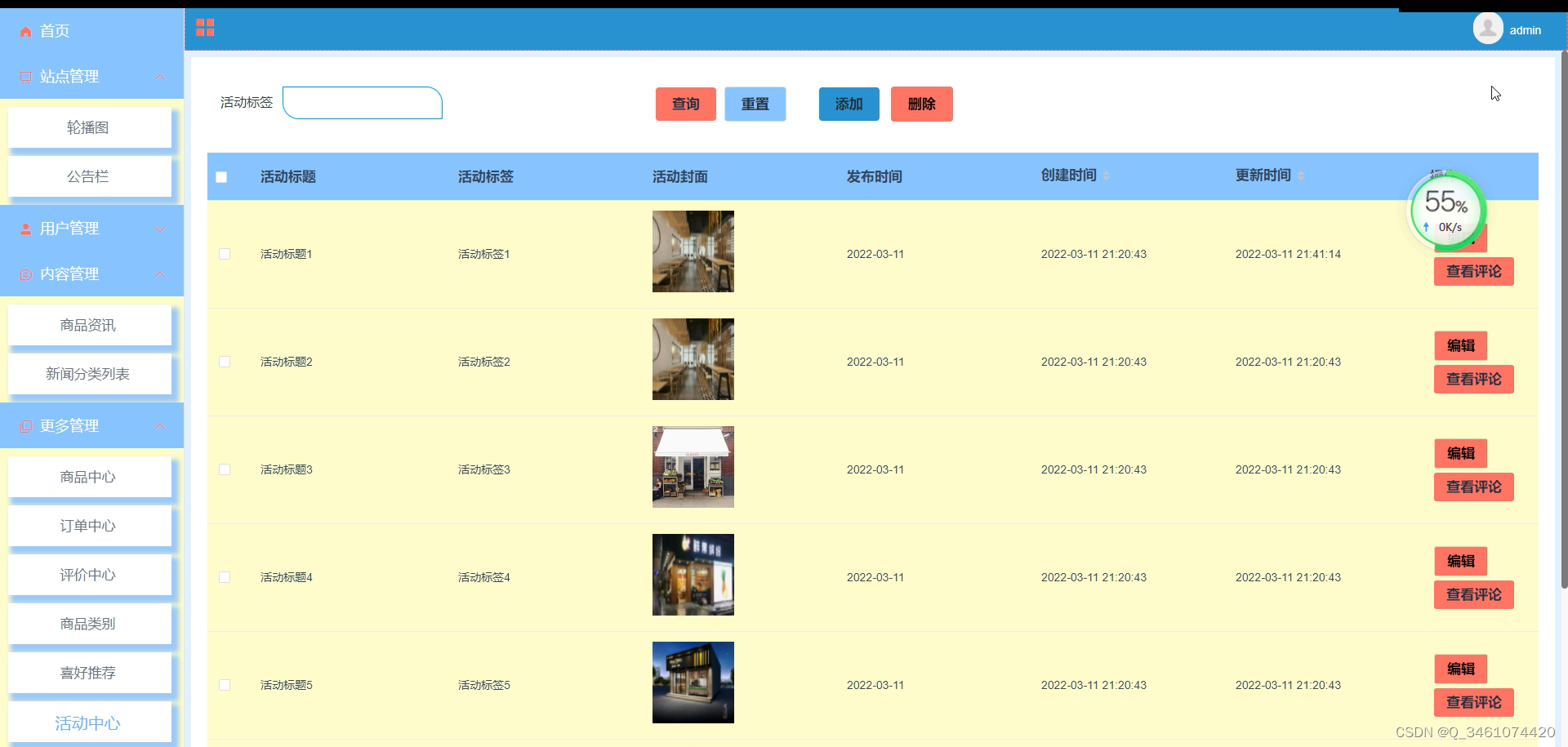 管理员进入系统后台可以查看功能:首页、首页、站点管理(轮播图、公告栏)用户管理(管理员、注册用户、商家)内容管理(商品资讯、新闻分类资讯))更多管理(商品中心、订单中心、评价中心、商品类别、喜好推荐、活动中心)等功能,还可进行相应的操作,如图5-2所示。