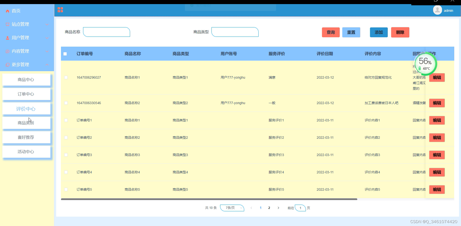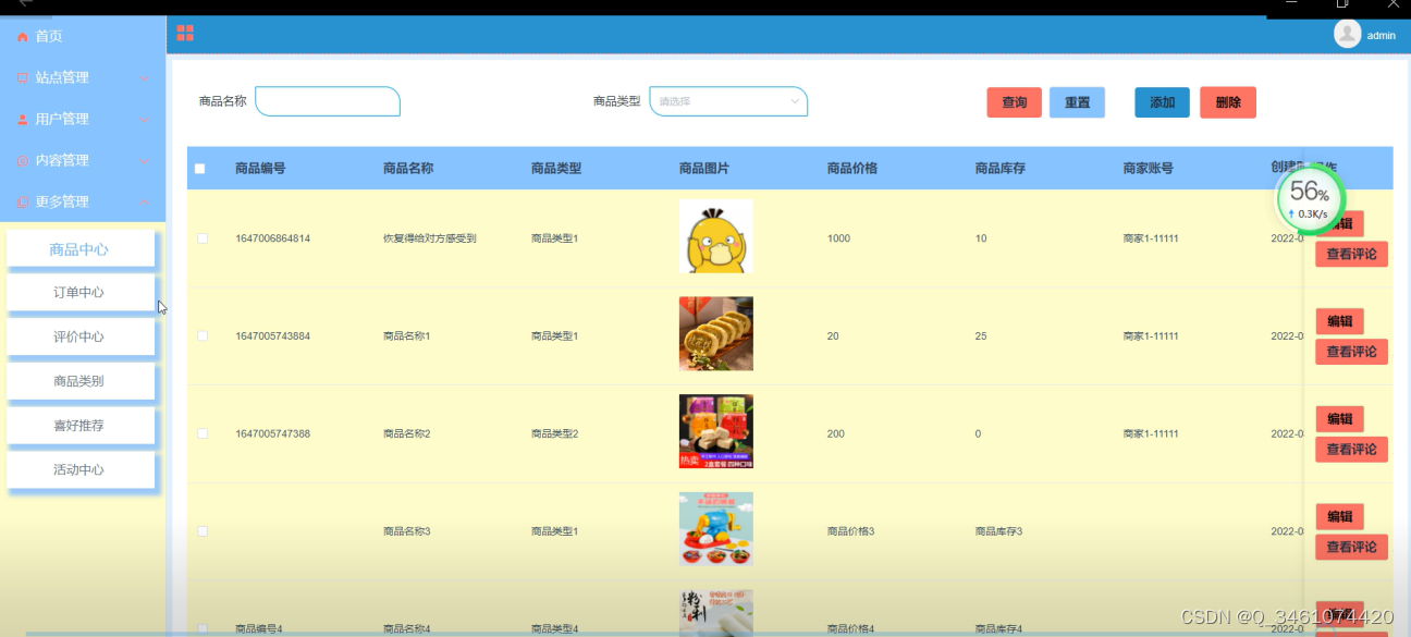 商品管理,在商品管理页面中可以添加商品信息:商品编号、商品名称、商品类别、价格、库存、图片、规格、商品介绍等内容,还可在商品查询页面对已有的商品进行评论管理、修改或删除详细等操作,如图5-7所示。