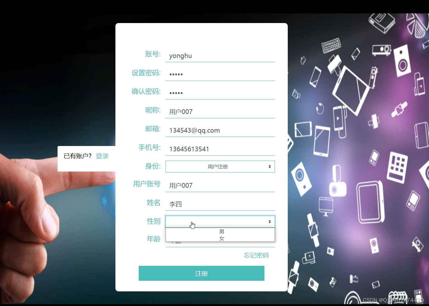 用户注册,在用户注册页面中可以填写注册信息:用户名、密码、姓名、性别、出生年月、QQ、邮箱、手机、身份证、头像、地址、备注等内容进行注册,如图5-11所示。