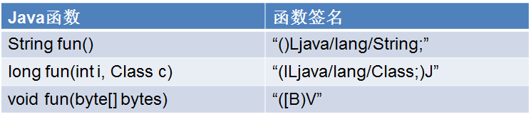 由于Java支持函数重载,因此仅仅根据函数名是没法找到对应的JNI函数。为了解决这个问题,JNI将参数类型和返回值类型作为函数的签名信息。